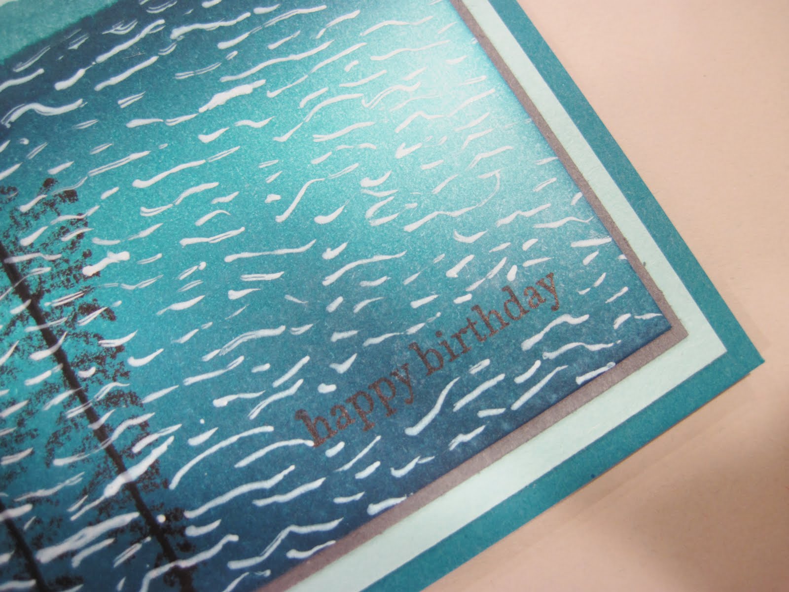 10. Brayer the top and bottom of this section with Night of Navy ink. Don't cover all of the Island Indigo ink. This layering of color will create the gradient affect in the color of the water.